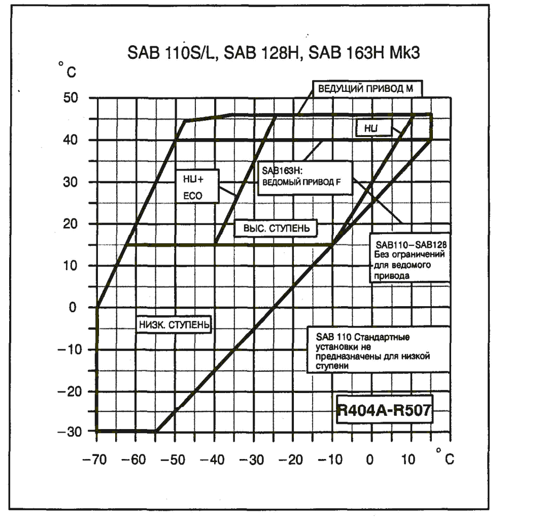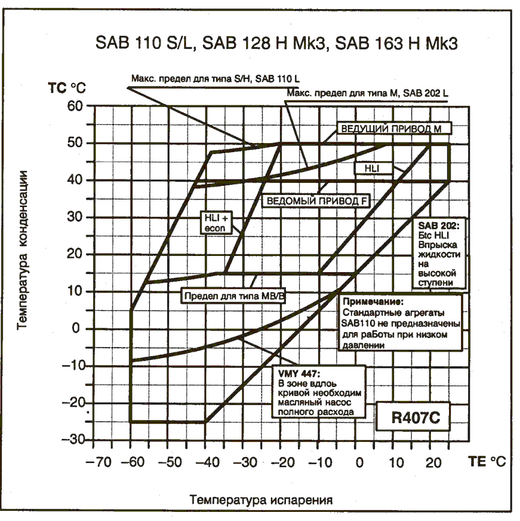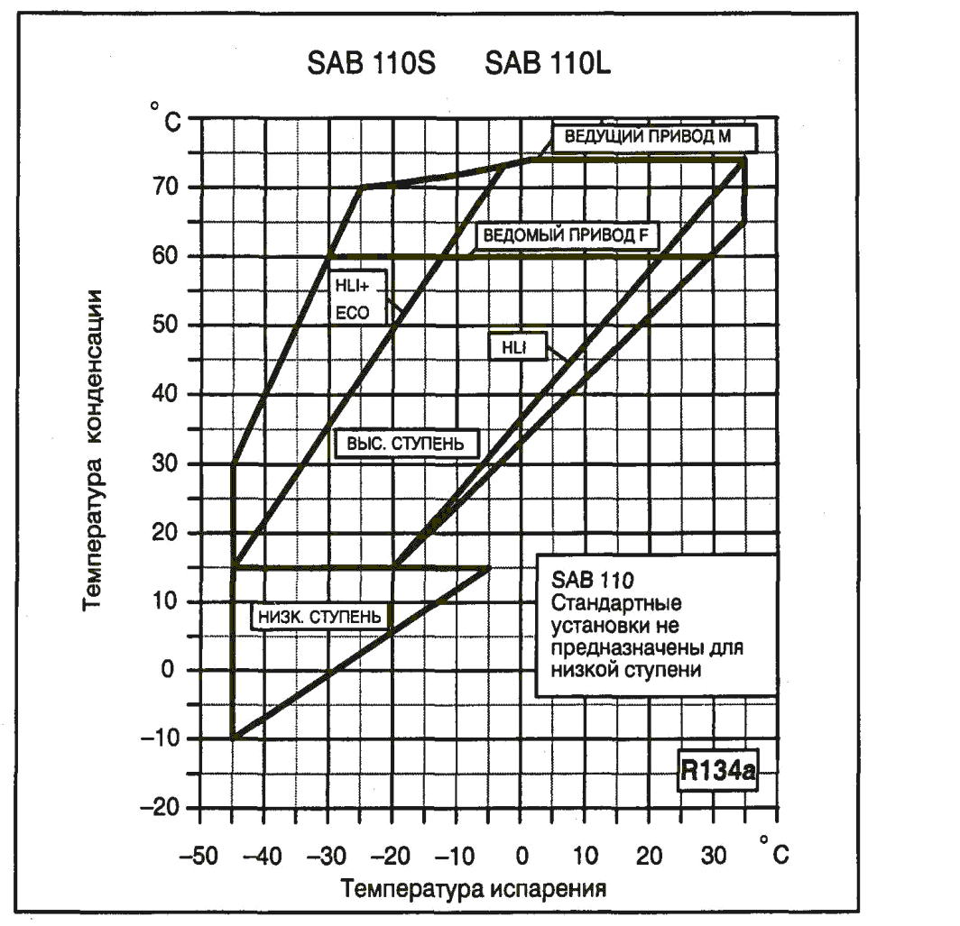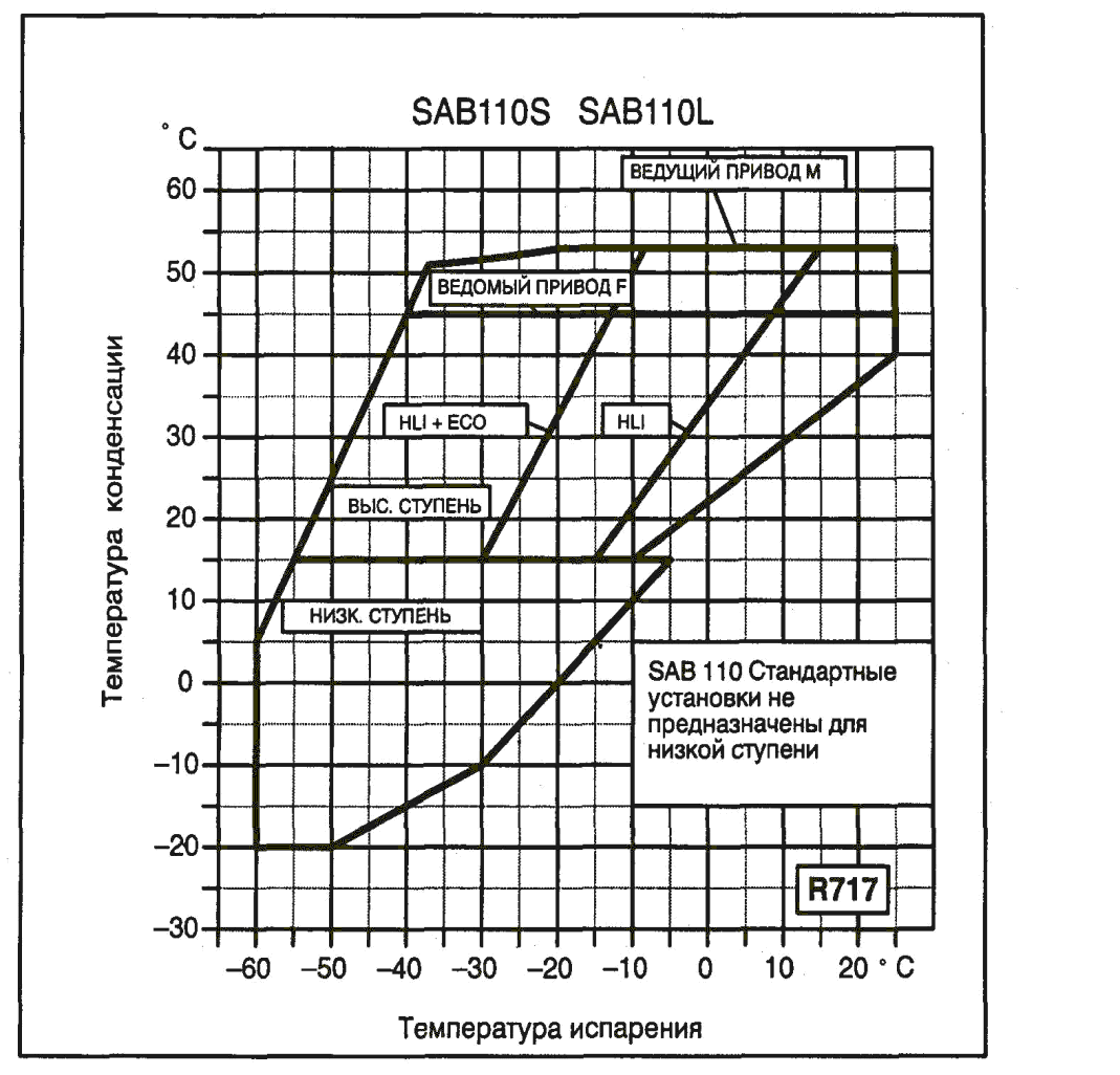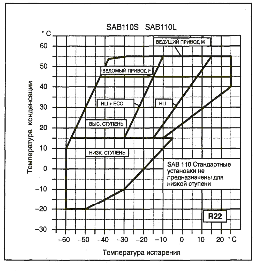 Компрессор SAB 110 работает на хладагентах R717 или R22 со следующими рабочими пределами: